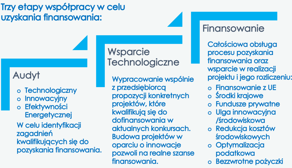 i programów europejskich dotyczy innowacji, know-how oraz nowych technologii, w tym rozwiązań dekarbonizacji procesów produkcji, usług oraz inwestycji w OZE. Gwarantujemy dopasowanie planowanych wydatków inwestycyjnych firmy do projektów opartych na efektywności energetycznej, innowacjach i gospodarce obiegu zamkniętego (GOZ). Dzięki współpracy z naszym Zespołem finansowym i technologicznym oferujemy kompleksowe doradztwo wspierające przedsiębiorców